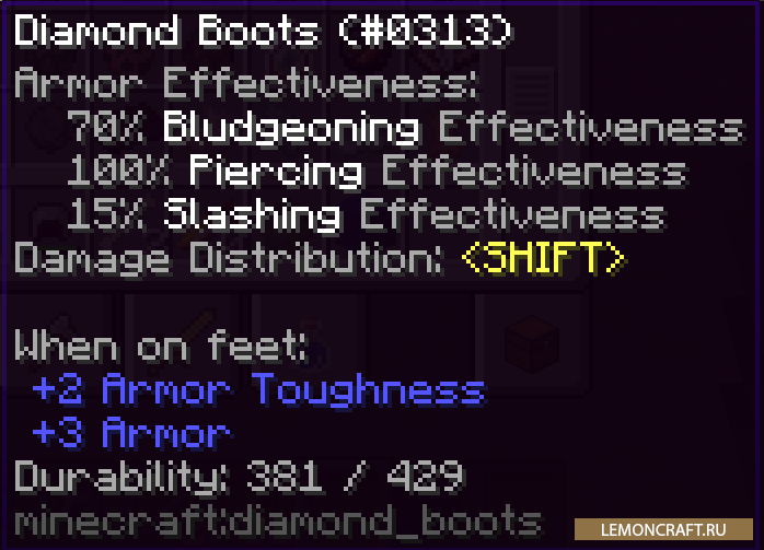 Мод на новую боевую систему Distinct Damage Descriptions добавляет в игру новую систему которая даст каждому предмету свою степень наносимого урона: дробящий, рубящий и колющий. При этом у каждого моба появится естественная защита на каждый вид наносимого урона. Соответственно мобы тоже будут использовать данную систему, атакуя вас в совершенно новом стиле.